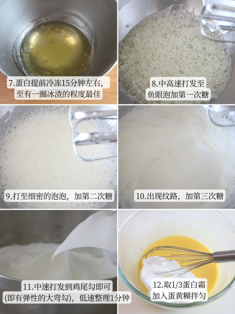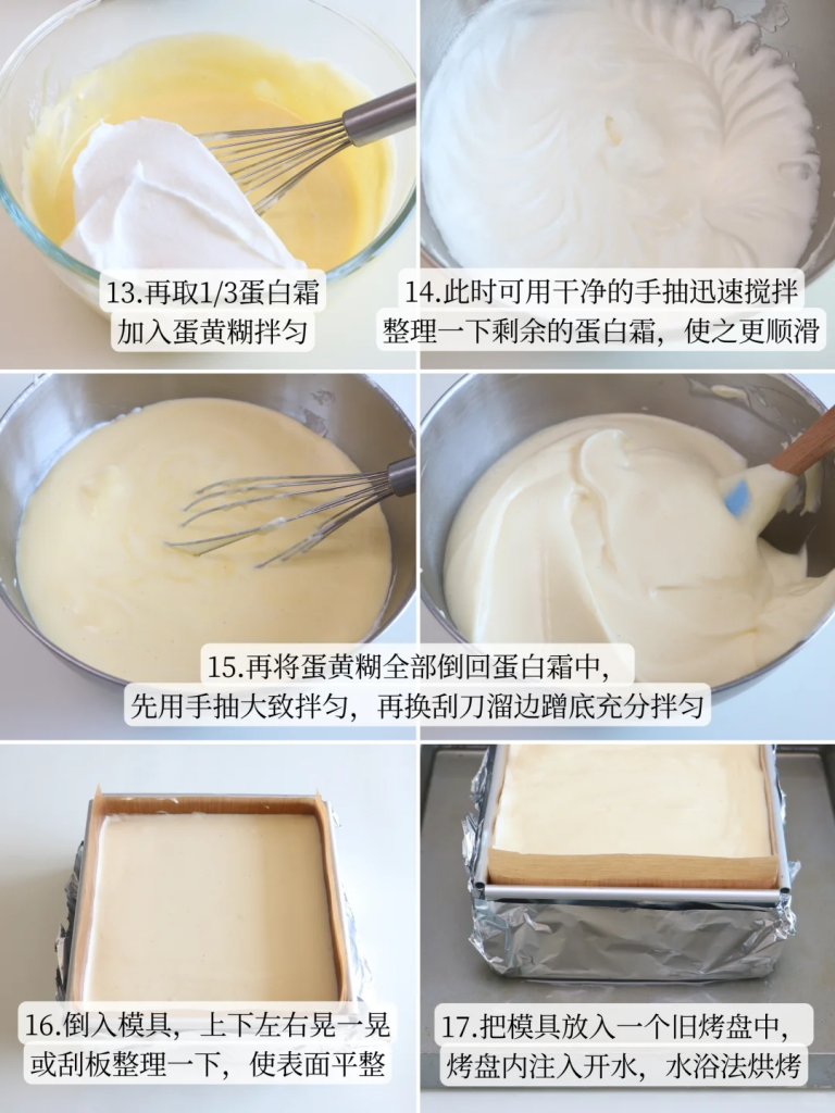 ▶️古早的蛋白霜要比戚风软一点,因古早追求光滑表面,蛋白硬了容易裂。且古早的蛋黄糊比较稀,蛋白硬了,密度相差太大,不易混匀