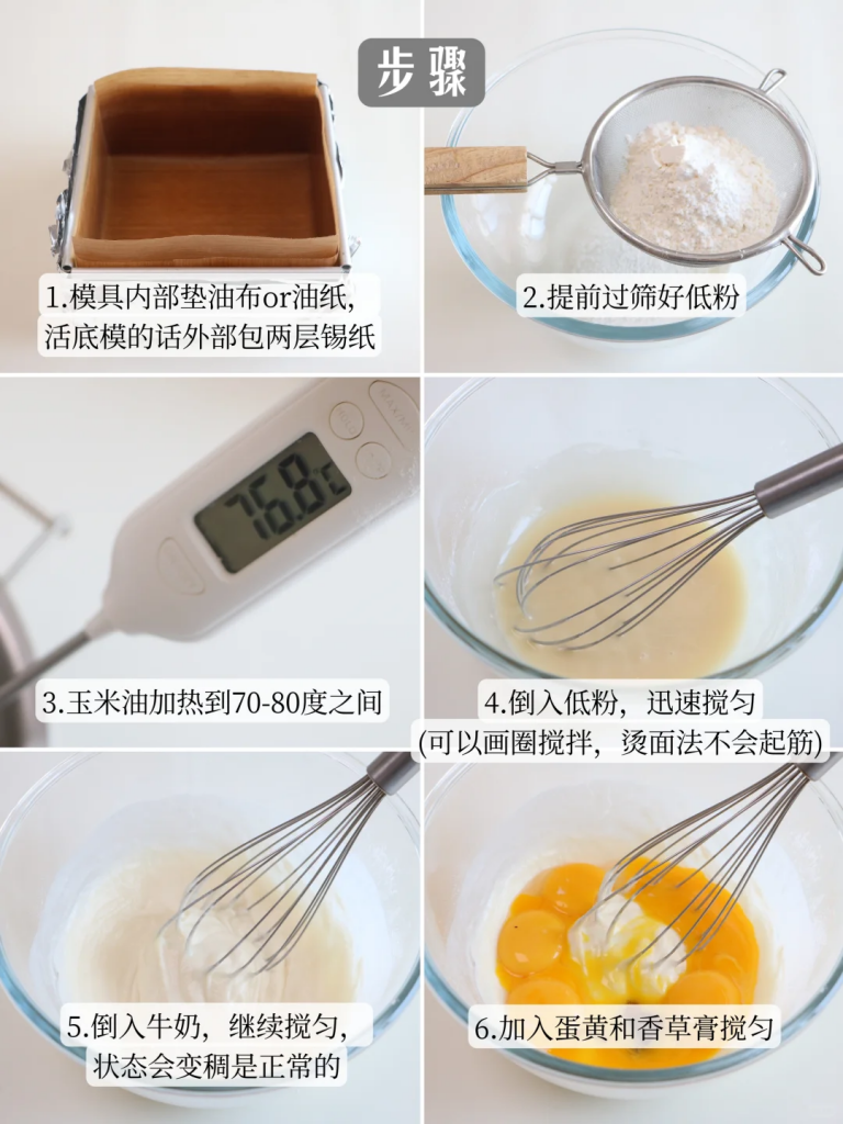 玉米油55g | 低粉68g | 牛奶65g | 蛋黄5个 | 香草膏2滴(没有可不放) | 蛋清5个 | 细砂糖55g