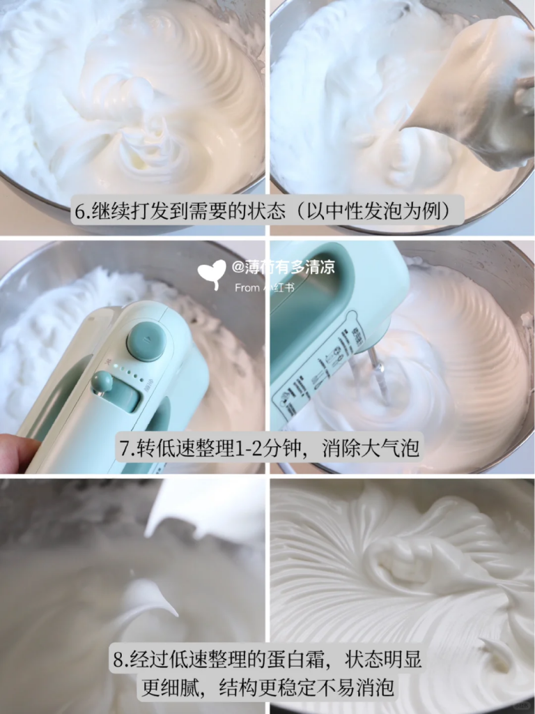 ▪️中高速打发+低速整理,即先中高速打到需要的状态,再转最小档整理1-2分钟,可让气泡结构更细腻和稳定