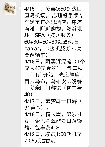 这次旅行我们购买超值机酒套餐每人2600元,确实很便宜。套餐包含去巴厘岛来回香港转机四程机票及回程香港一天住宿,那么便宜的价格红眼航班是必须的。提前在携程上预定了巴厘岛的酒店,宜必思是以比较实惠的价格和服务赢得大多数人的认可,还预定当地2天的包车服务