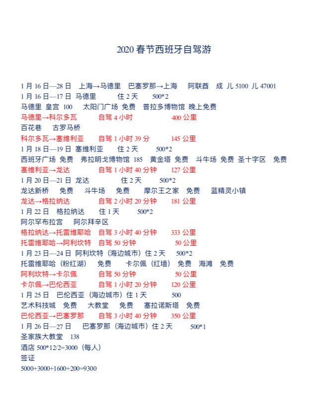 2020年西班牙之旅1月16日-30日,西班牙之旅是我第一次跨洲际旅行,行程都是参考各种资料和旅游攻略完成,这次是自驾游,开车也是通过谷歌地图规划路线,旅游提前九个月开始规划,考虑到春节可能涨价提前七个月买好机票,为了最合理化时间安排,机票时间为上海晚上11点出发,当地时间第二天中午1点到达,回程当地时间晚上10点的飞机。之后几个月不断完善行程,提前五个月预定酒店和民宿,为了在国外能顺利入住,酒店订单都用三种语言打印出来。提前四个月预定当地租车,提前三个月准备资料办理申根签,欧洲对儿童出行非常苛刻,提供很多证明并且需要公正机构出具关系证明,因为第一次办理申根签担心被拒,都通过朋友介绍中介办理,顺利出签。提前一个月就把需要预约的热门景点门票买好。之后的一个月就是准备出行需要带的物品和兑换货币。我们乘坐的是土豪航空公司阿联酋航空,行程都是迪拜转机全程空客A380客机,马德里进一路自驾至巴塞罗那出。话说当时的土豪航空经济舱服务还是非常到位的,上飞机一人一个洗漱包(袜子、牙膏、牙刷、眼罩、耳塞),每儿童有一套打发时间玩具,儿童还有工作人员提供的拍照服务,让我印象深刻。