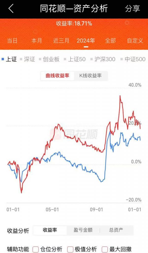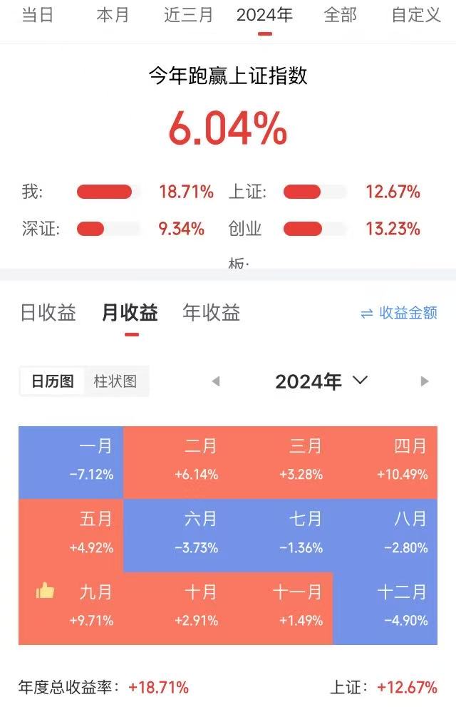 股市沉浮 2024年股市小结 作者菜菜 2024 年 5 月 1 日2025 年 5 月 20 日 2024年的A股市场,可以用波澜壮阔、见证历史来形容。2月5日沪指探底2635点后持续震荡走弱。9月24日在多重政策刺激下,市场走出强势反弹行情,上证指数一度冲破3674的年内最高点,但12月31日市场出现大幅下跌。主要股指全线上涨,沪指全年上涨12.67%,深证成指上涨9.34%,创业板指上涨13.23%,科创50指数上涨16.07%,仅北证50指数下跌4.14%,个人账户全年涨18.71%,盈利跑赢大盘6.04%
