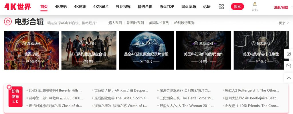 电影网站 4K世界 作者菜菜 2024 年 6 月 7 日 https://www.4ksj.com 4K世界是一个专注于4K高品质资源下载的论坛,提供最新最全的4K电影、电视剧、VR视频、壁纸等资源,以及字幕、音轨、演示片等相关内容。在这里,你可以找到国内外各种4K片源, …