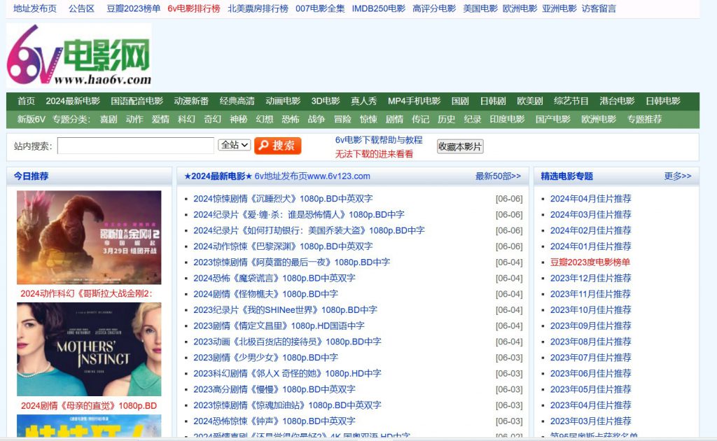 电影网站 6V电影 作者菜菜 2024 年 6 月 7 日 https://www.hao6v.cc 6v电影,每天搜集互联网最新电影和电视剧,为使用迅雷软件的用户提供最新的电影、电视剧、高清电影、免费下载等服务
