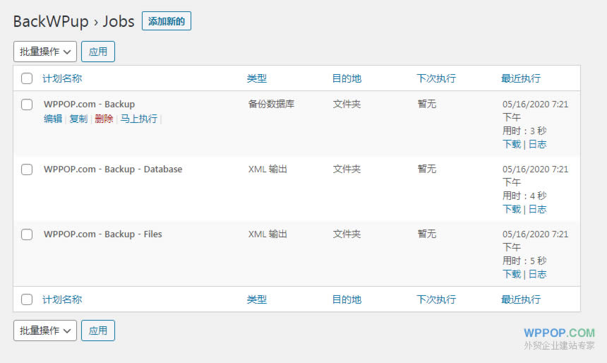使用上面的添加备份计划方法,我们可以根据不同的备份需求,使用BackWPup创建多个不同的备份作业。例如,您可以创建备份计划以每天或每周运行以备份WordPress数据库,而创建另一个备份计划以手动运行以仅备份WordPress文件。您可以在【 BackWPup – 计划 】页面查看您创建的所有备份计划。您可以通过单击每个备份计划作业下方的 【 马上执行 】链接来运行任何备份计划。当然,您也可以编辑每个备份作业设置或将其完全删除。如下图所示: