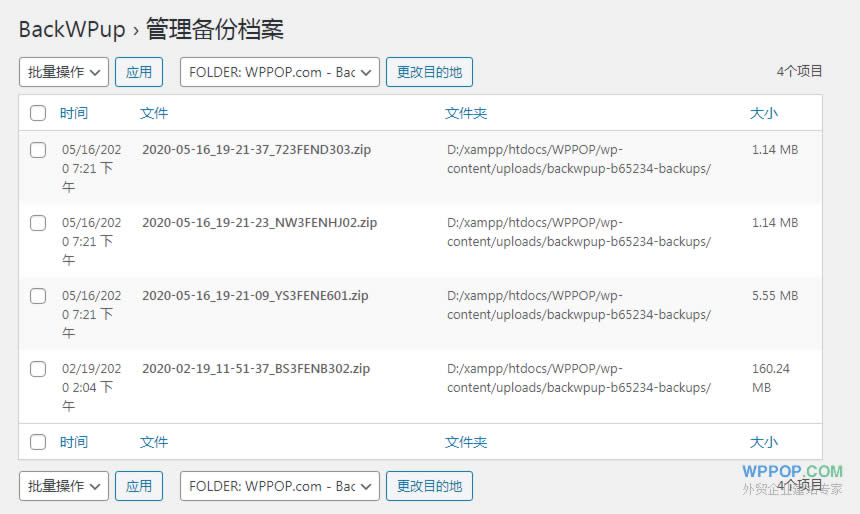 在后台的管理菜单中找到【 BackWPup – 备份 】页面,我们可以管理所有的备份数据,比如:删除备份、下载备份、或者更改备份数据的备份位置等,如下图所示: