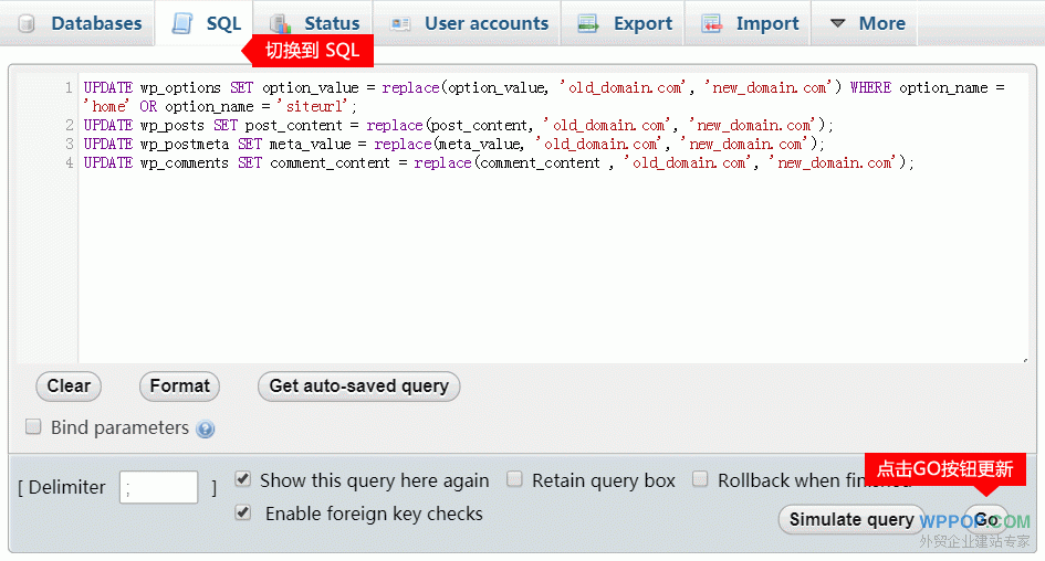 把下面的WordPress新旧域名替换命令复制到 SQL 标签页的命令框中,如上图所示,命令代码如下:
