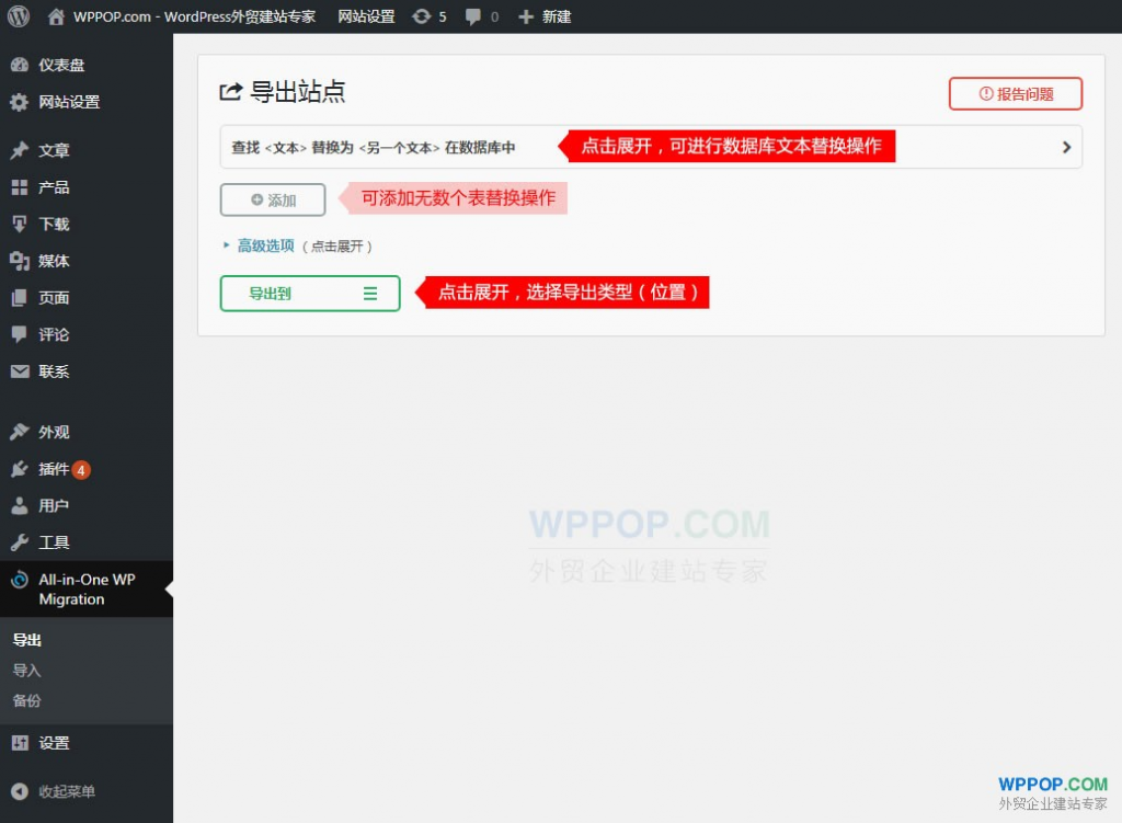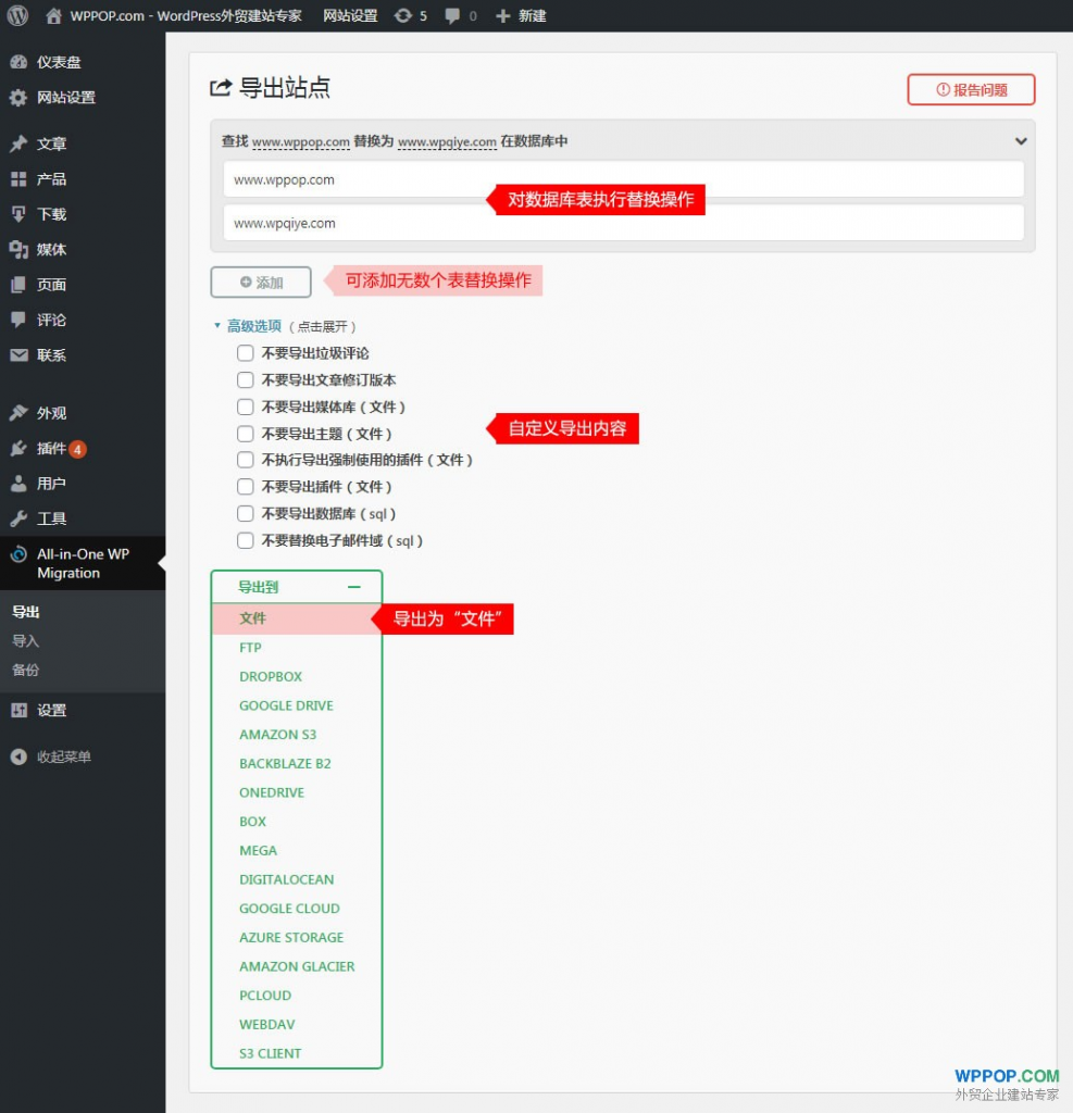 1.2.1 查找 <文本> 替换为 <另一个文本> 在数据库中:该项的功能就是,帮助我们在迁移网站时,先查找并替换网站数据库中的某些数据。例如,我们需要修改网站的域名(旧域名是www.wppop.com,新域名是www.wpqiye.com),那么,我们就可以展开该项,在 查找 项填写旧域名www.wppop.com,在 替换为 项填写新域名www.wpqiye.com。