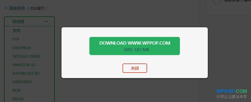 备份成功之后,点击弹窗中的 Download 按钮下载网站数据文件到你的本地 电脑 硬盘就行。All in one WP migration 插件下载的文件是以 .wpress 扩展名命名的,更改此扩展名会导致网站迁移失败,因此请保持原样,不要修改。