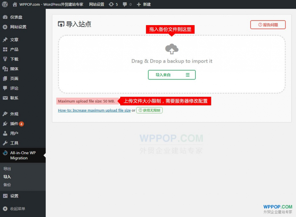2.1 在WordPress网站后台管理菜单中找到 【 All-in-One WP Migration 】下的 【 导入 】项并进入页面,如下图所示:
