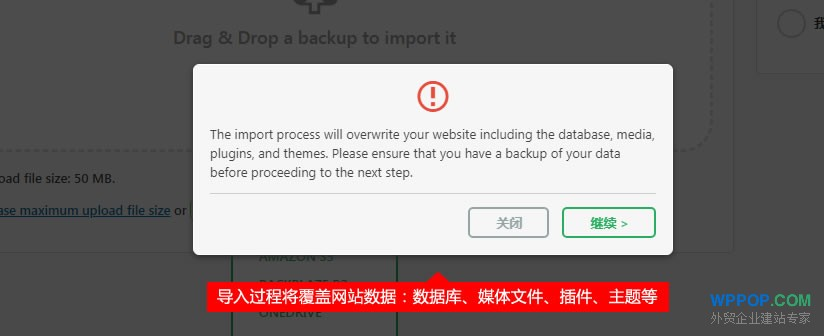 导入时, All in One WP Migration 会提示是否要覆盖原网站的数据,包括数据库、媒体文件、插件和主题等(如果当前网站有重要数据,请务必请备份好后再进行导入操作),此时,我们点击 继续 按钮执行即可。 导入过程所需时间视备份文件大小而定,再导入完成前不要关闭当前页面,也不要对网站进行其他任何操作。