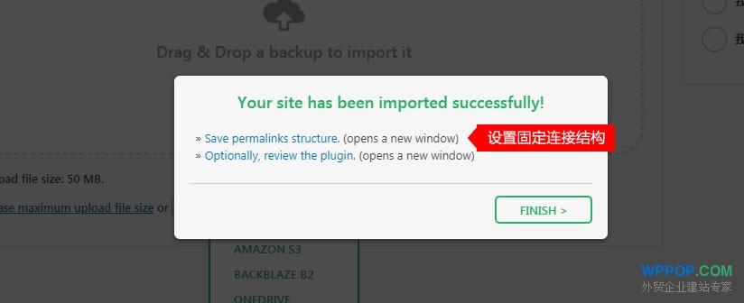 2.3 导入完成后,会出现导入成功的提示界面,在弹窗中,会提示我们进行网站的 固定连接结构的设置保存,如下图所示: